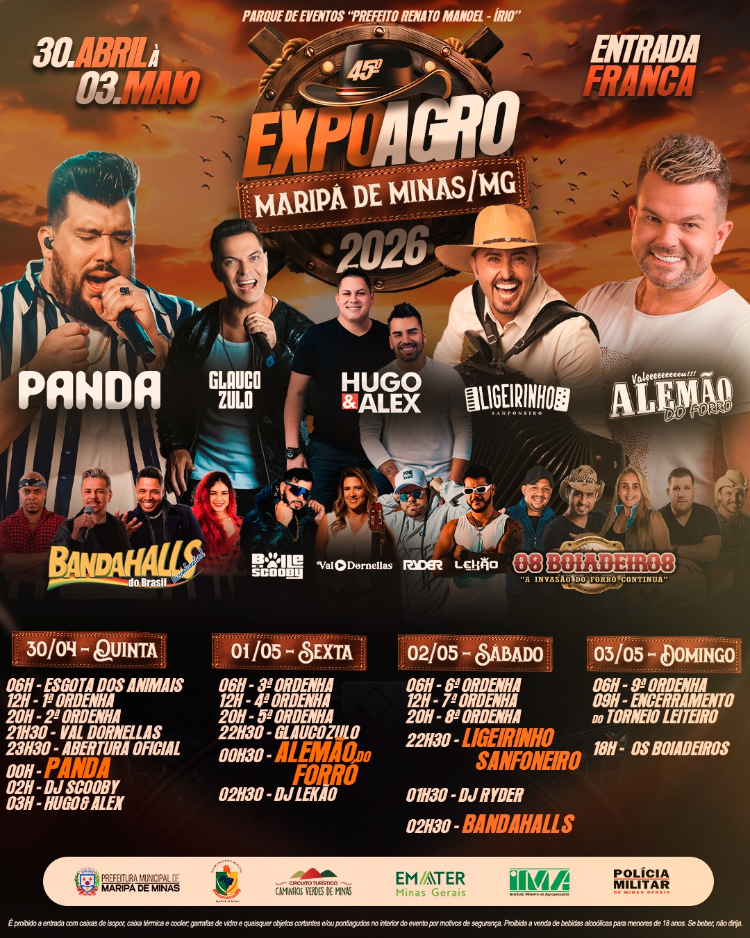 A programação musical é um verdadeiro convite à alegria e à união. Na sexta-feira, dia 01/05, o público vibrará ao som do “Rei do Forró”, Alemão do Forró, que traz toda sua energia contagiante para o palco principal. Mas não para por aí: nomes como Panda, Glauco Zulo, Hugo & Alex, Ligeirinho Sanfoneiro, Banda Halls do Brasil e Os Boiadeiros garantirão noites e madrugadas de muita emoção, ritmo e dança, embalados também pelos DJs Scooby, Lekão e Ryder.